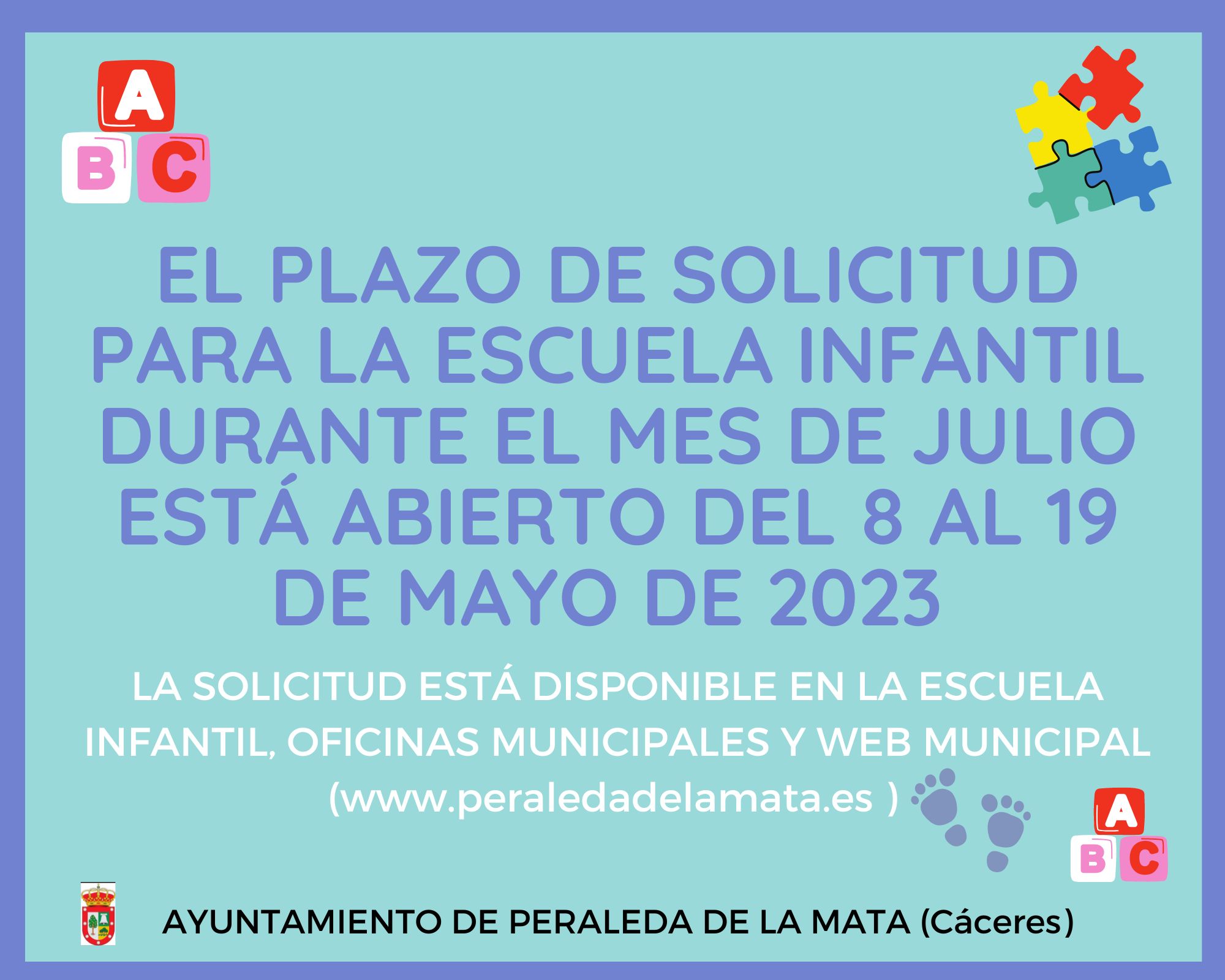 Del 8 a 19 de mayo está abierto el plazo para solicitar los servicios de la Escuela Infantil Municipal durante el mes de julio. Los interesados deben presentar el modelo de solicitud en el Registro del Ayuntamiento. En archivo adjunto, puede acceder al documento de solicitud, también disponible en las instalaciones de la Escuela Infantil, oficinas municipales y web municipal .