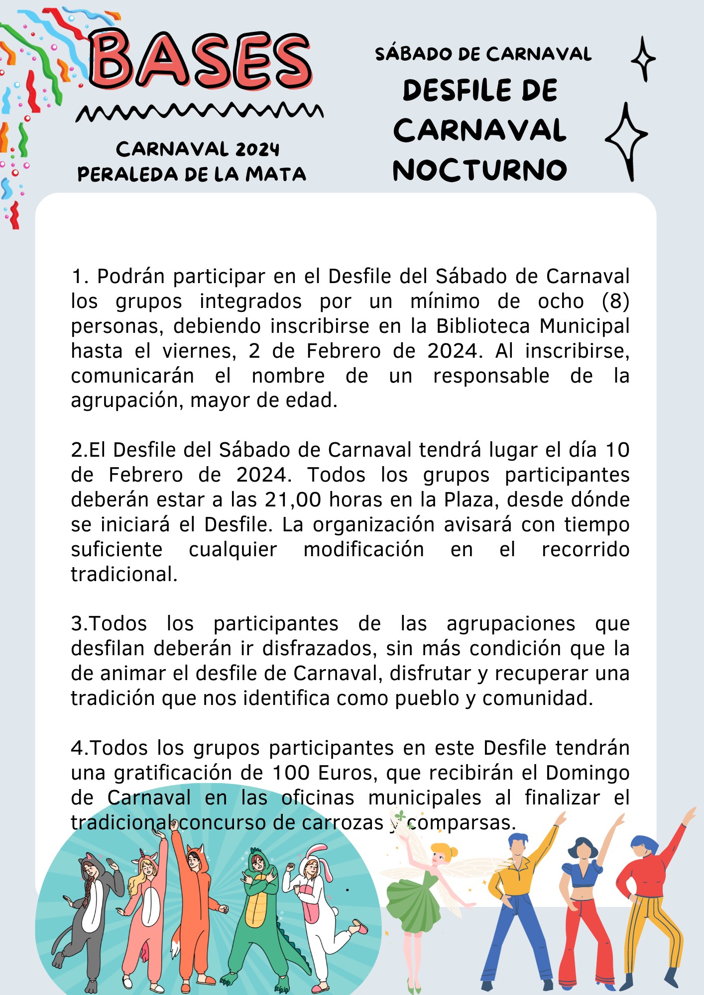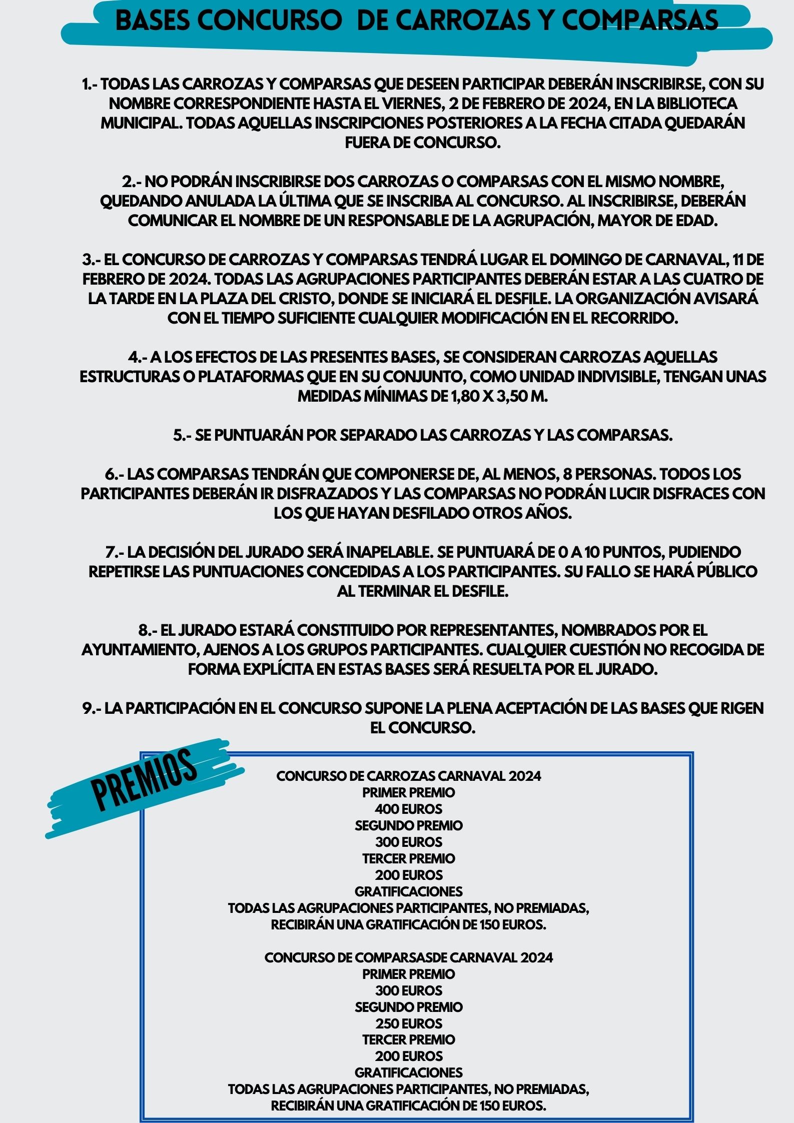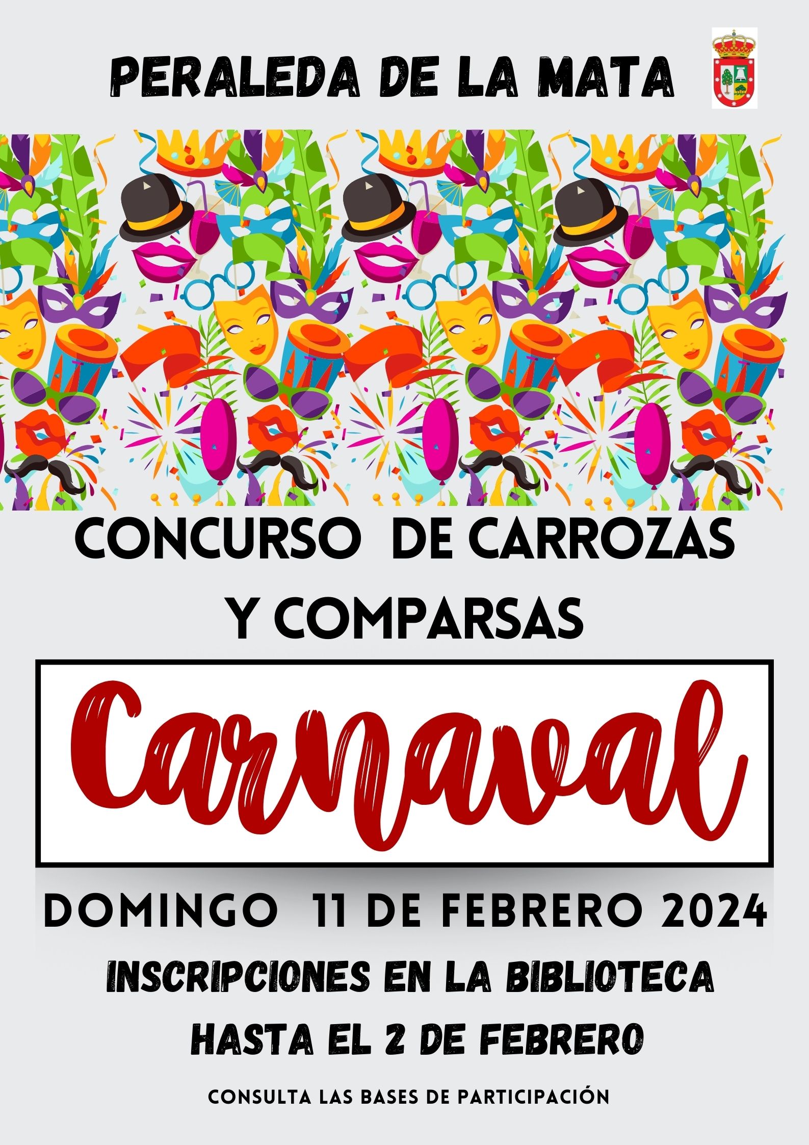 Hasta el próximo 2 de febrero está abierto el plazo de inscripción para participar en los distintos concursos carnavaleros promovidos por este Ayuntamiento con motivo de las próximas fiestas de Carnaval 2024. En archivo adjunto podéis consultar las bases del concurso de carrozas y comparsas del domingo de Carnaval (11 de febrero) así como el desfile nocturno del sábado de carnaval (10 de febrero de 2024) . Los grupos participantes deben inscribirse en la Biblioteca Municipal (Lunes-Viernes 16-20 horas 927 559 127) .