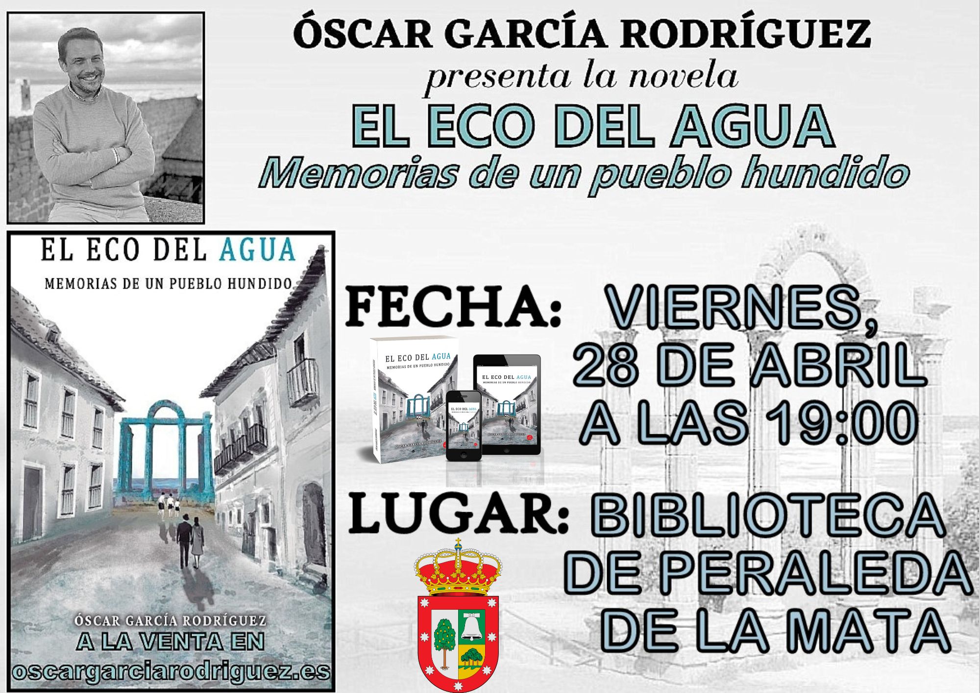 PRESENTACION DEL LIBRO "Los Ecos del Agua" 25 abril 2023 El próximo viernes, 28 de Abril, tendrá lugar la presentación del libro "El Eco del Agua: Memorias de un pueblo hundido" del escritor Oscar García. Será en la Biblioteca Municipal a las 19,00 horas.