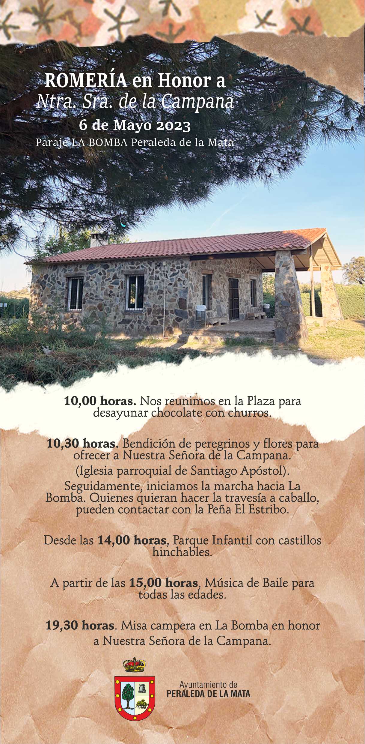 El sábado 6 de mayo, Peraleda de la Mata acoge una nueva edición de la Romería en el paraje de la Bomba. Y este 2023, cumplimos quince años de Romería. Adjunto os dejamos el programa de actividades de este encuentro primaveral que se ha consolidado en nuestro municipio, deseando que lo disfrutéis en la mejor compañía.