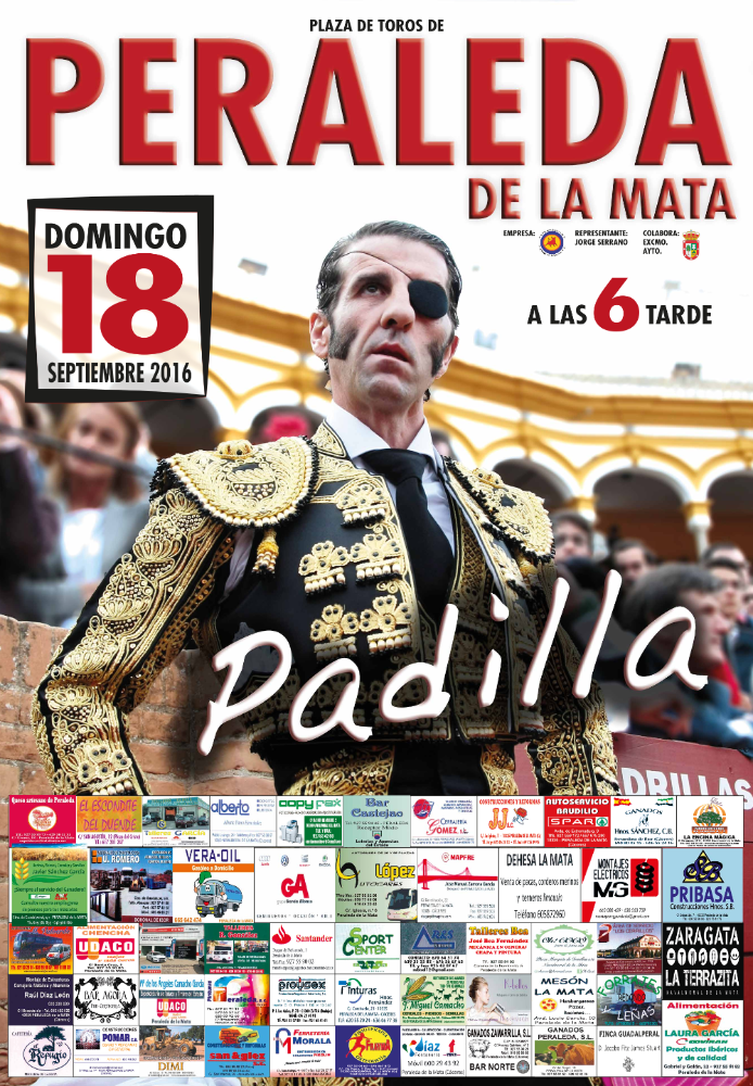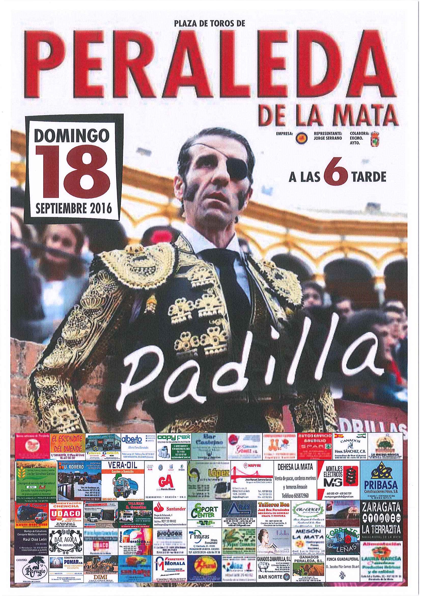 Presentado el cartel de la corrida de toros mixta que se celebrará en Peraleda de la Mata el próximo 18 de Septiembre con motivo de las Fiestas del Stmo. Cristo de la Humildad, y que contará con la privilegiada presencia del maestro Juan José Padilla. Completan el cartel el rejoneador Manuel Manzanares y el novillero Daniel Araujo. Próximamente, y a través de la web municipal y redes sociales, os presentaremos el programa completo de nuestras fiestas patronales.