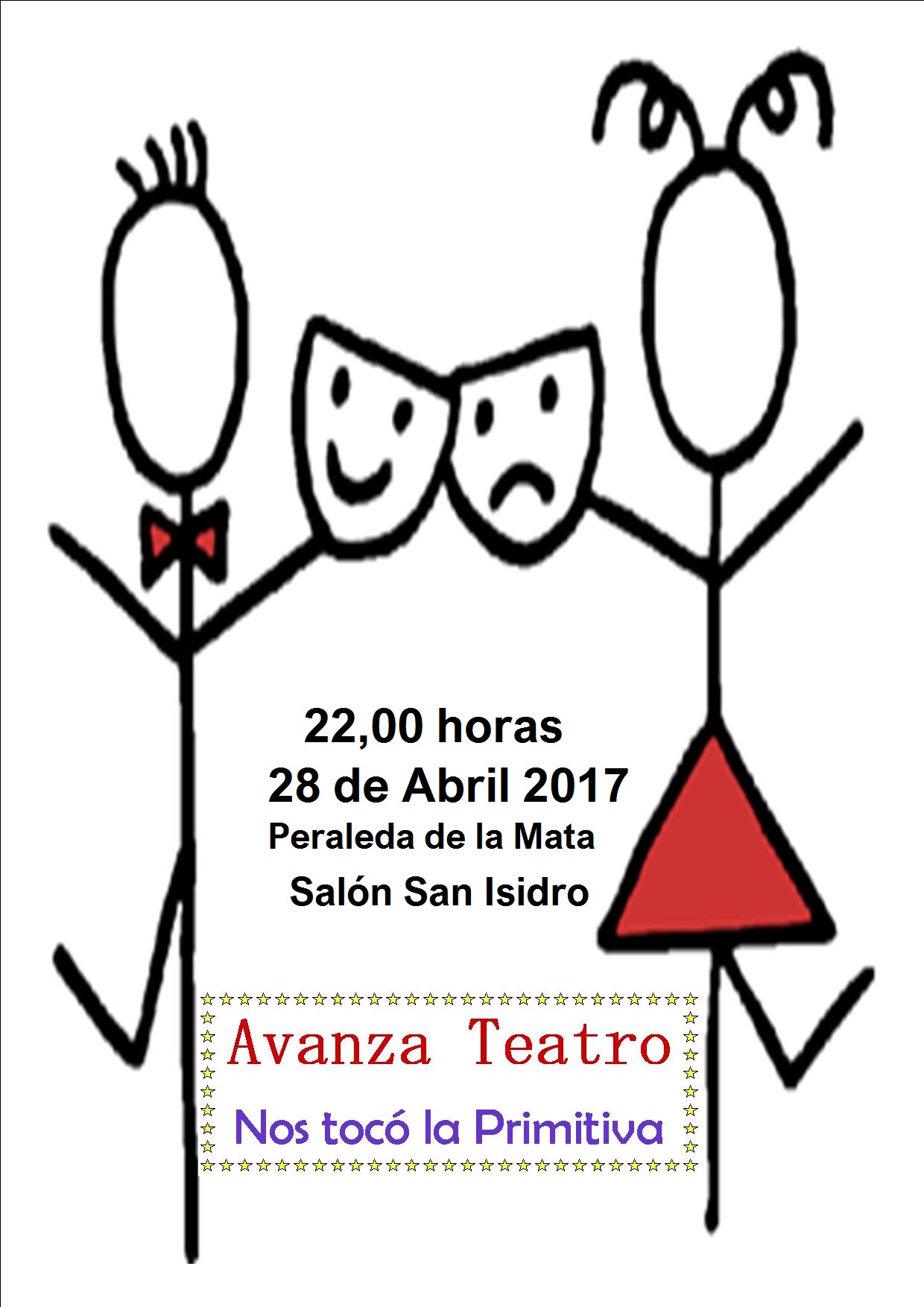 Peraleda la Mata acogerá el próximo viernes, 28 de Abril, la representación de la obra"Nos Tocó la Primitiva" a cargo del Grupo Teatro Avanza. Será en el Salón San Isidro a partir de las 22,00 horas. Una comedia recomendada para todos los públicos. La actividad está dentro del programa de la Primavera Cultural.