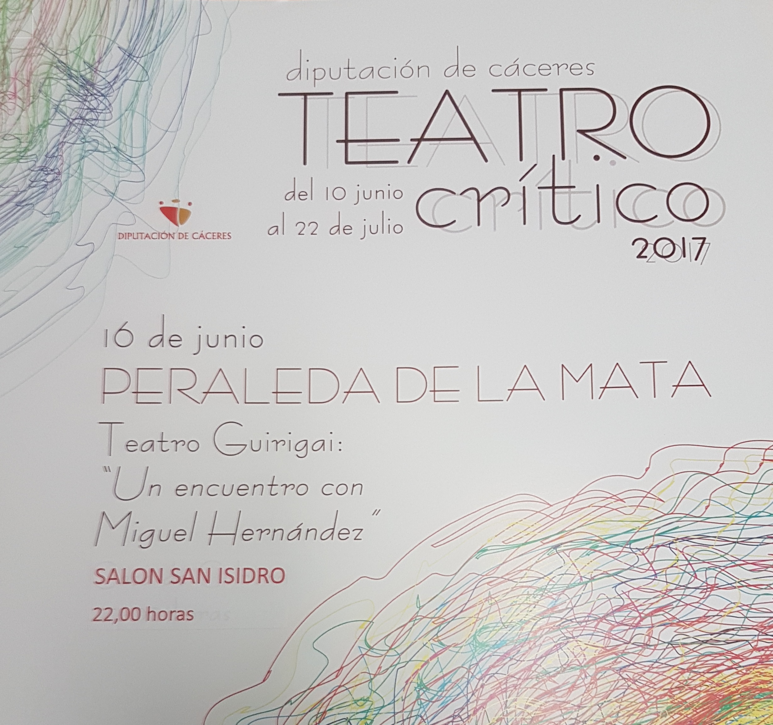 El próximo viernes, 16 de Junio, Peraleda de la Mata acogerá la representación teatral "Un encuentro con Miguel Hernández" a cargo de la compañia Guirigai, dentro del ciclo de Teatro Crítico que promueve la Excma. Diputación de Cáceres. Será en el Salón San Isidro a partir de las 22,00 horas.