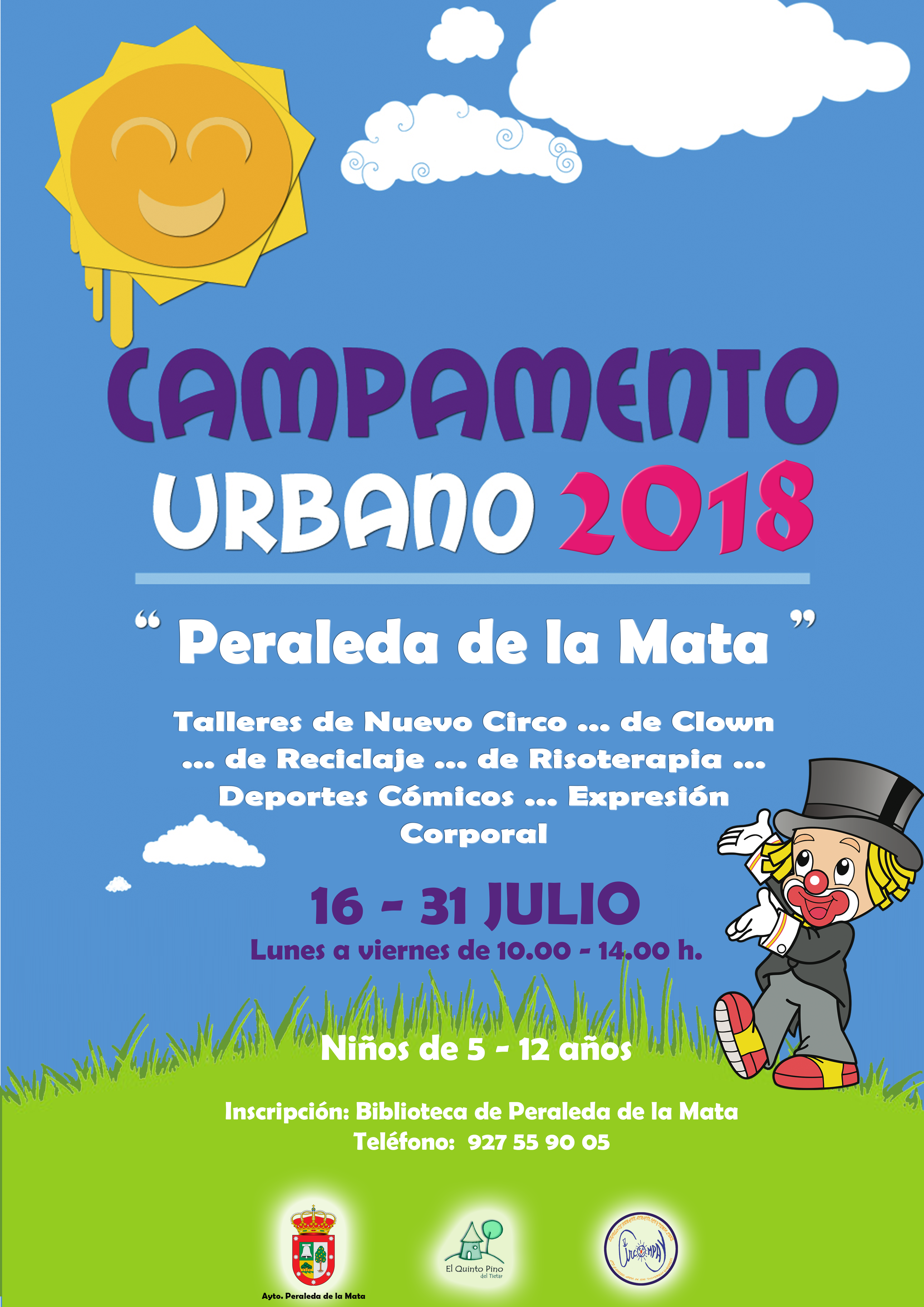 Abierto el plazo de inscripción para el Campamento Urbano 2018. Las actividades, dirigidas a niños entre 5 y 12 años, se desarrollarán en la segunda quincena del mes de julio. Las inscripciones deben realizarse en la Biblioteca Municipal en horario de 10,00 a 14,00 horas. El plazo de inscripción finaliza el próximo 6 de Julio.