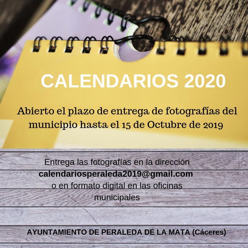 El Ayuntamiento de Peraleda d ela Mata, a través de la Diputación de Cáceres, tiene previsto la elaboración e impresión de calendarios con fotografías del municpio para el próximo año 2020. Todos los vecinos que dispongan de fotrografías de Peraleda para la composición del calendario 2020 pueden hacerlas llegar a la dirección de correo electrónico calendariosperaleda2019@gmail.com o entregarlas en formato digital en las oficinas municipales. El plazo finaliza el próximo 15 de Octubre. En la oficina virtual- sección bandos- podéis consultar la convocatoria.