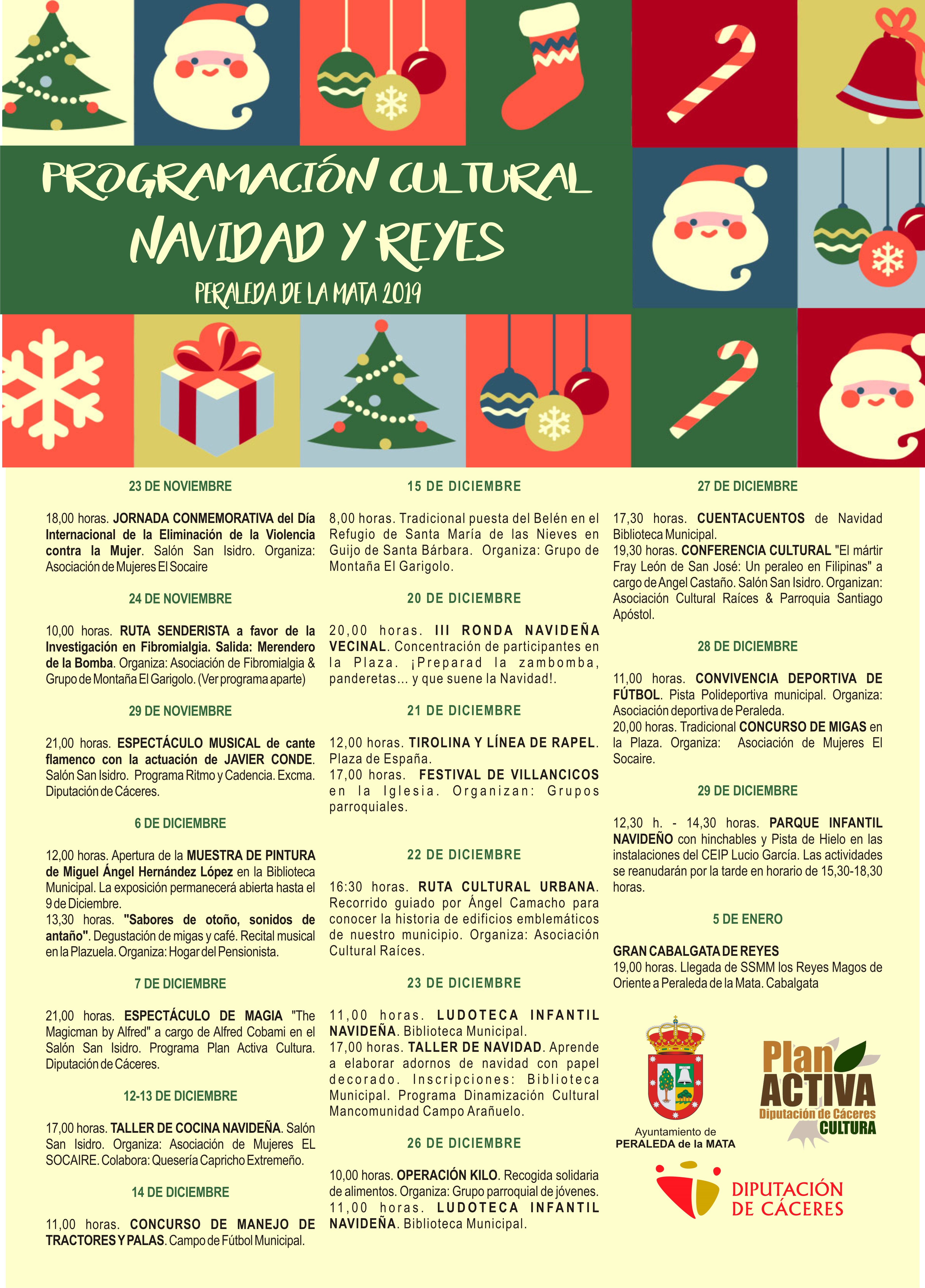 Con la conmemoración del Día Internacional de la Eliminación de la Violencia de Género, se inicia el sábado 23 de Noviembre el programa de actividades culturales que se desarrollará en Peraleda de la Mata durante el mes de noviembre y diciembre, organizado por este Ayuntamiento en colaboración con los grupos y asociaciones locales. Precisamente, el próximo domingo tendrá lugar una Marcha Senderista a favor de la investigación en fibromialgia, organizada por la Asociación Sonería y el Grupo de Montaña el Garigolo. En archivo adjunto, podéis consultar la programación completa. ! A disfrutarla¡