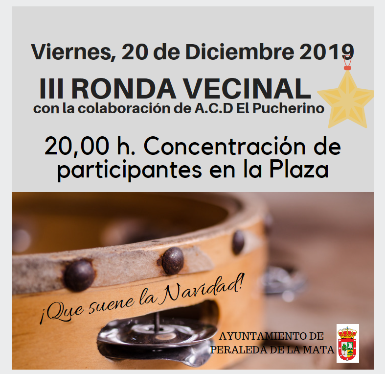 El próximo viernes, 20 de Diciembre, Peraleda de la Mata acoge la III Ronda Navideña Vecinal, organizada en colaboración con la Asociación Cultural El Pucherino, dentro del Programa de actividades Navidad 2019. La concentración de participantes será en la Plaza a partir de las 20,00 horas.